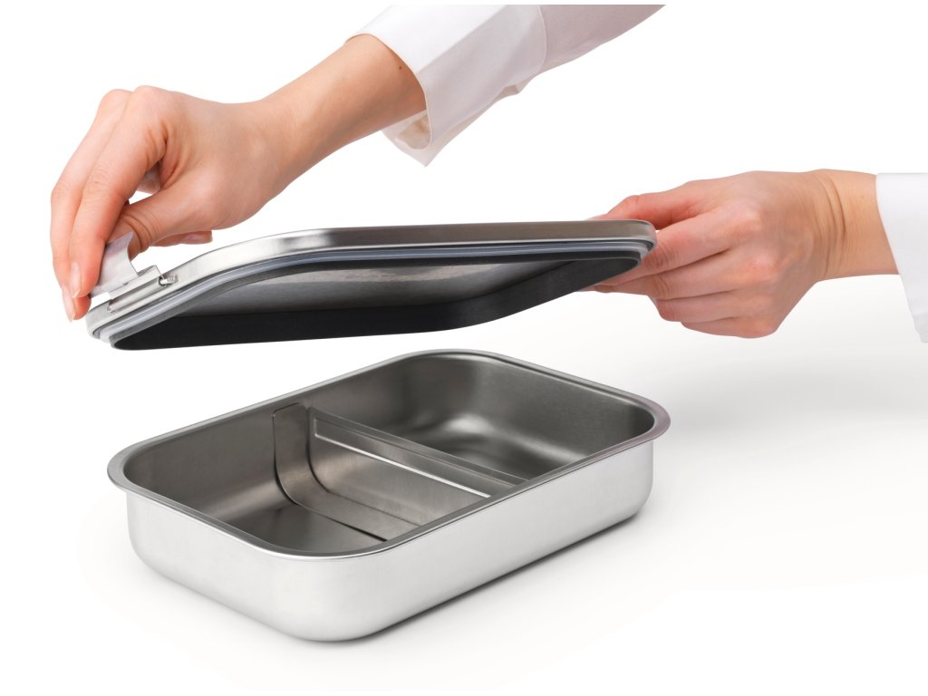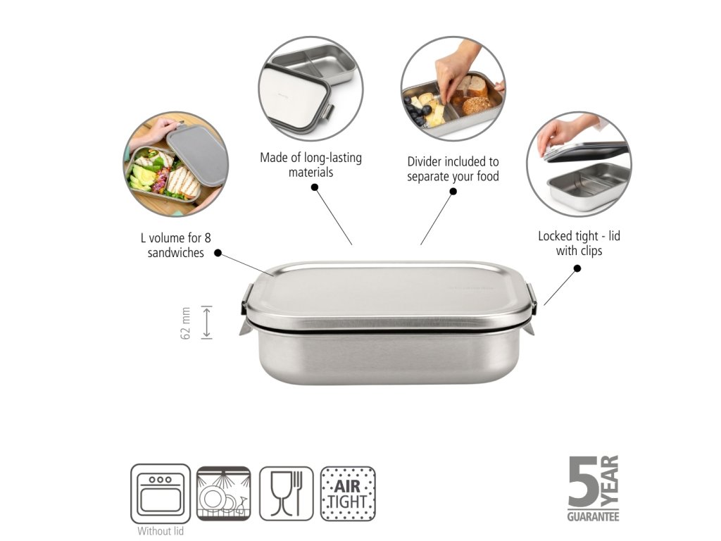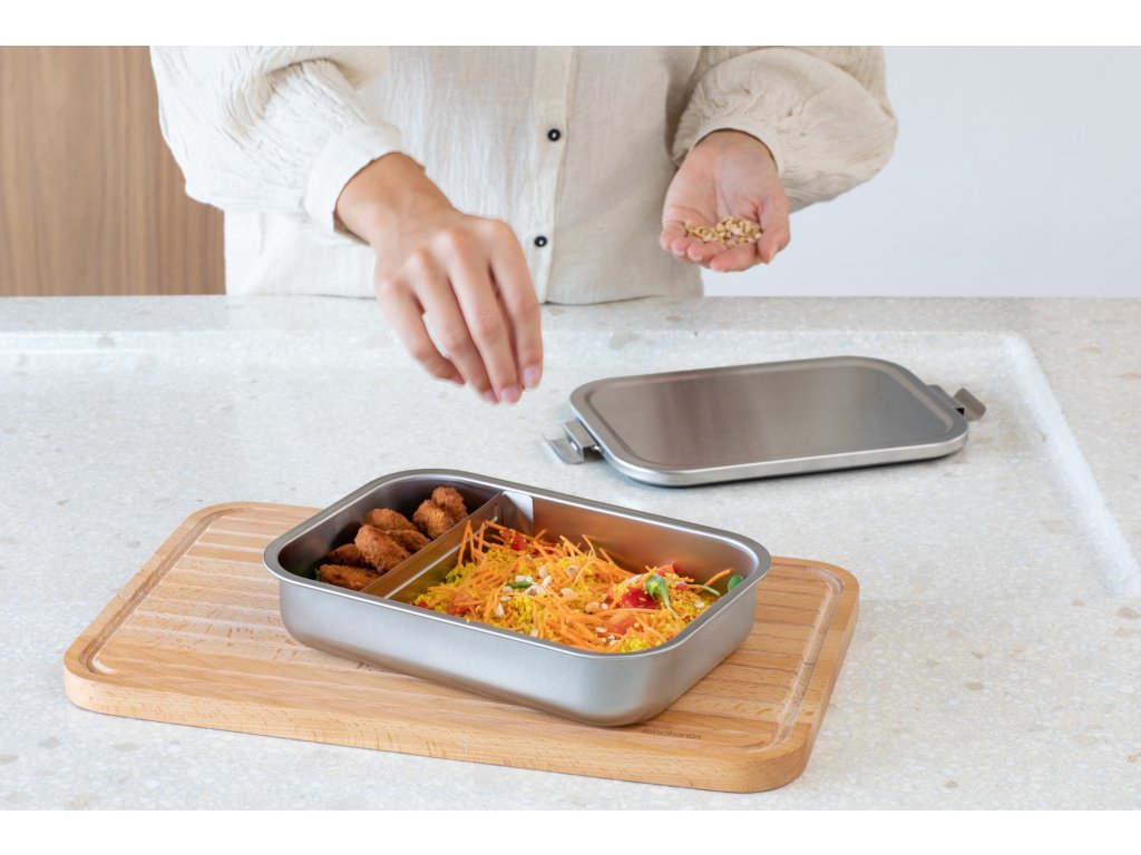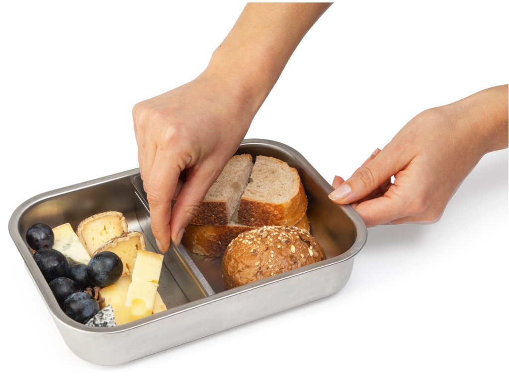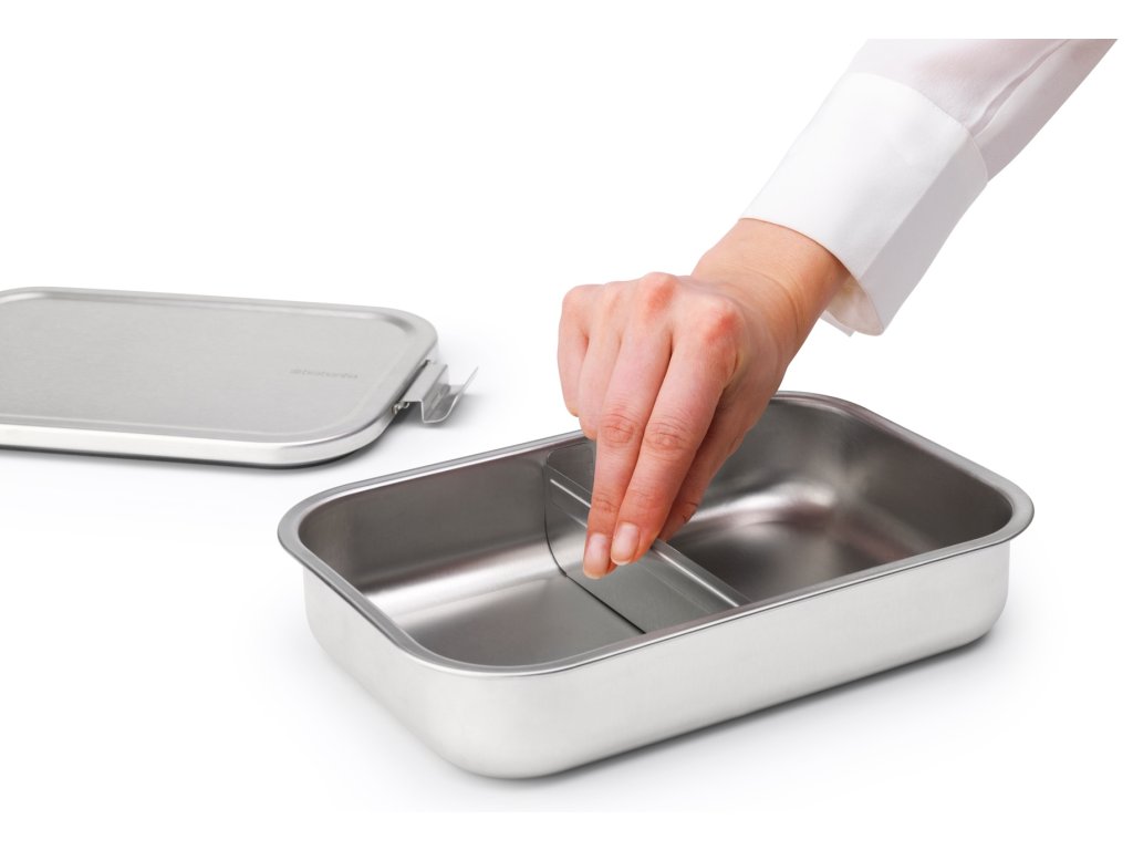 Od sendvičů až po torttily a rohlíky, udržujte je oddělené a v bezpečí před rozmačkáním v tomto velkém boxu na oběd. Tato nádoba je vyrobena z vysoce kvalitní nerezové oceli a má přepážku, kterou můžete umístit dle libosti.
