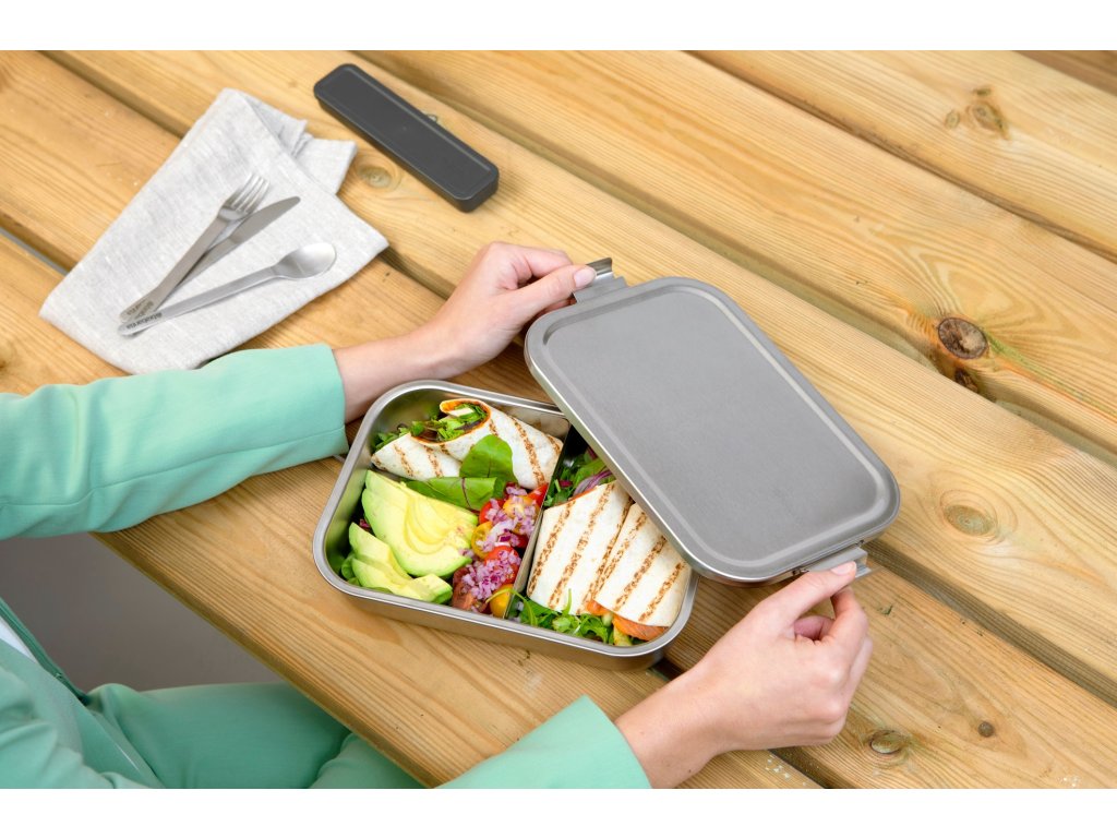 Odolný - opakovaně použitelný obědový box vyrobený z vysoce kvalitní nerezové oceli.