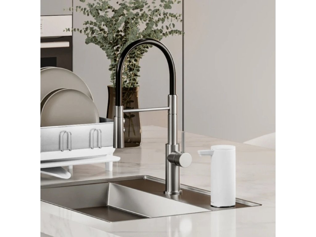 V dávkovači mýdla Simplehuman je uloženo výkonné čerpadlo, které zajišťuje plynulé dávkování mýdla. Nehrozí ucpání ventilu ani dávkovací hadičky.