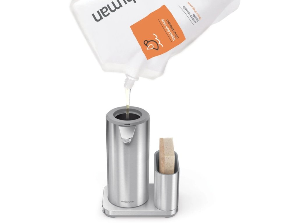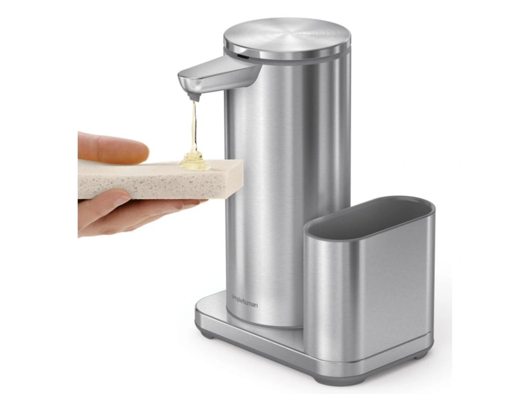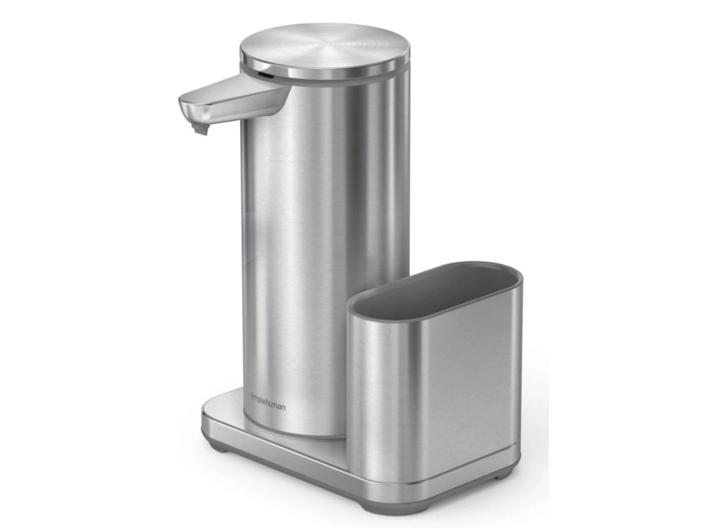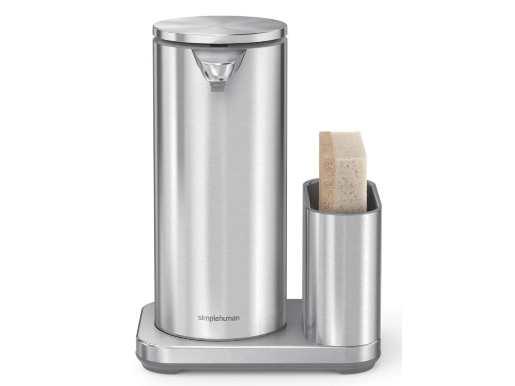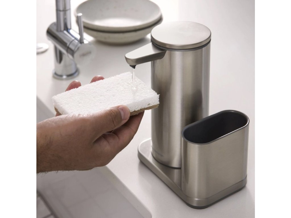 Bezdotykový dávkovač mýdla Simplehuman – 414 ml + držák na houbičku, nerez ocel