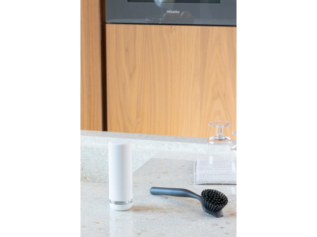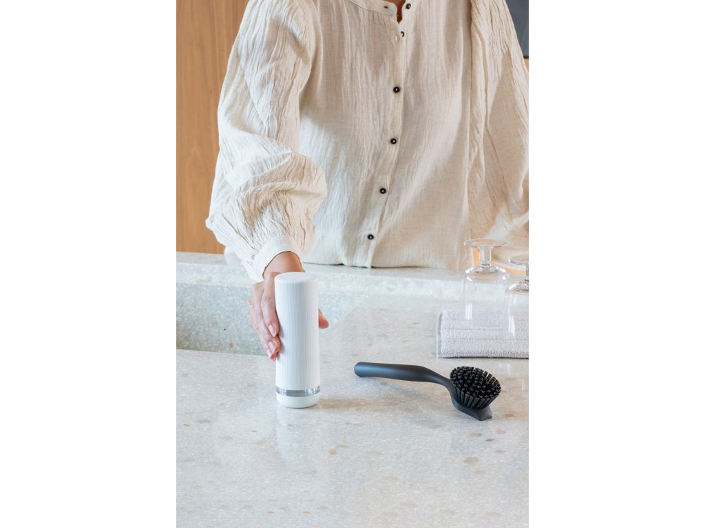 Už nemusíte schovávat prostředek na mytí nádobí. Stačí stylově uložit 200 ml vašeho oblíbeného saponátu na nádobí s tímto vymačkávačem Brabantia SinkStyle. Flexibilní protiskluzový a nekapající design, který při ždímání uvolňuje mycí prostředek. Tento dávkovač snadno naplňte pomocí odnímatelného šroubovacího uzávěru. Snadné zmáčknutí!