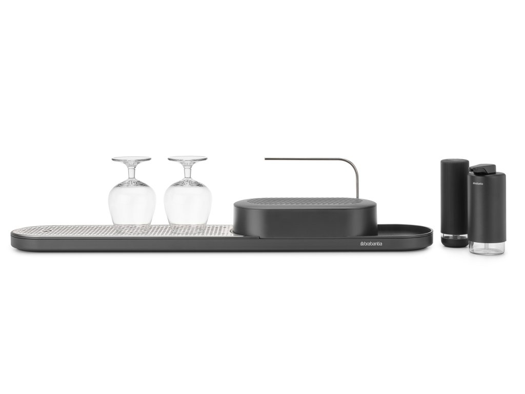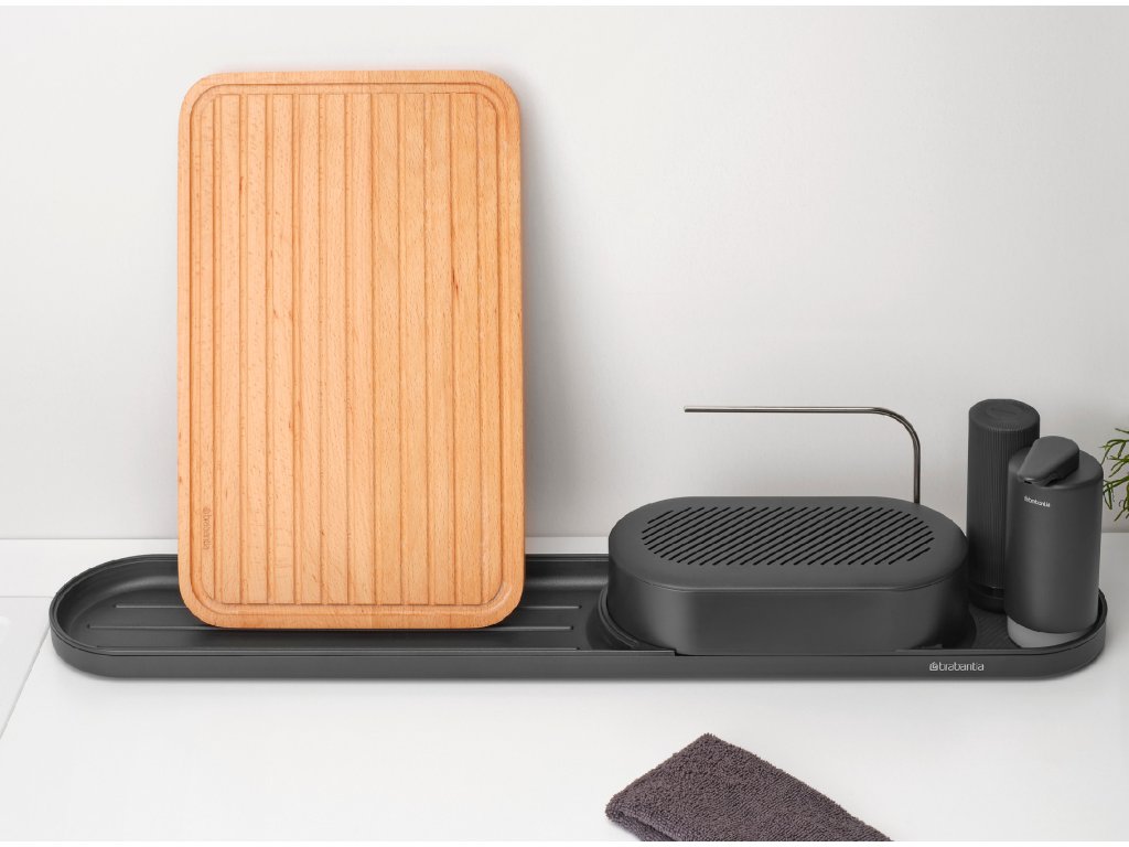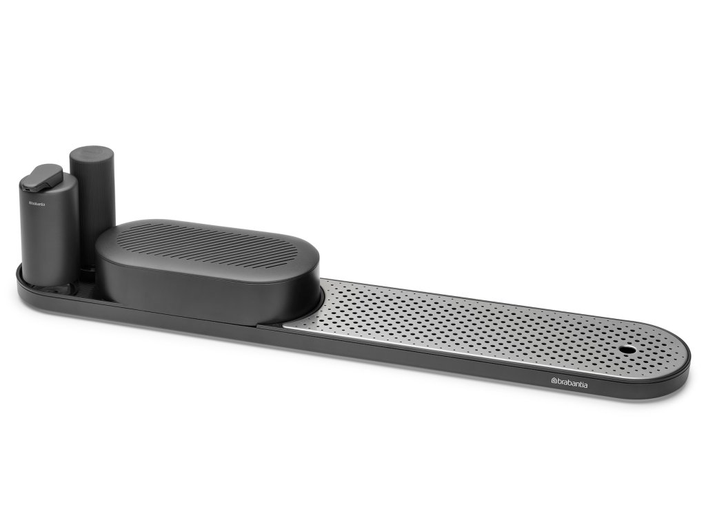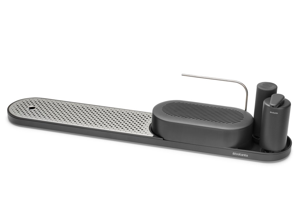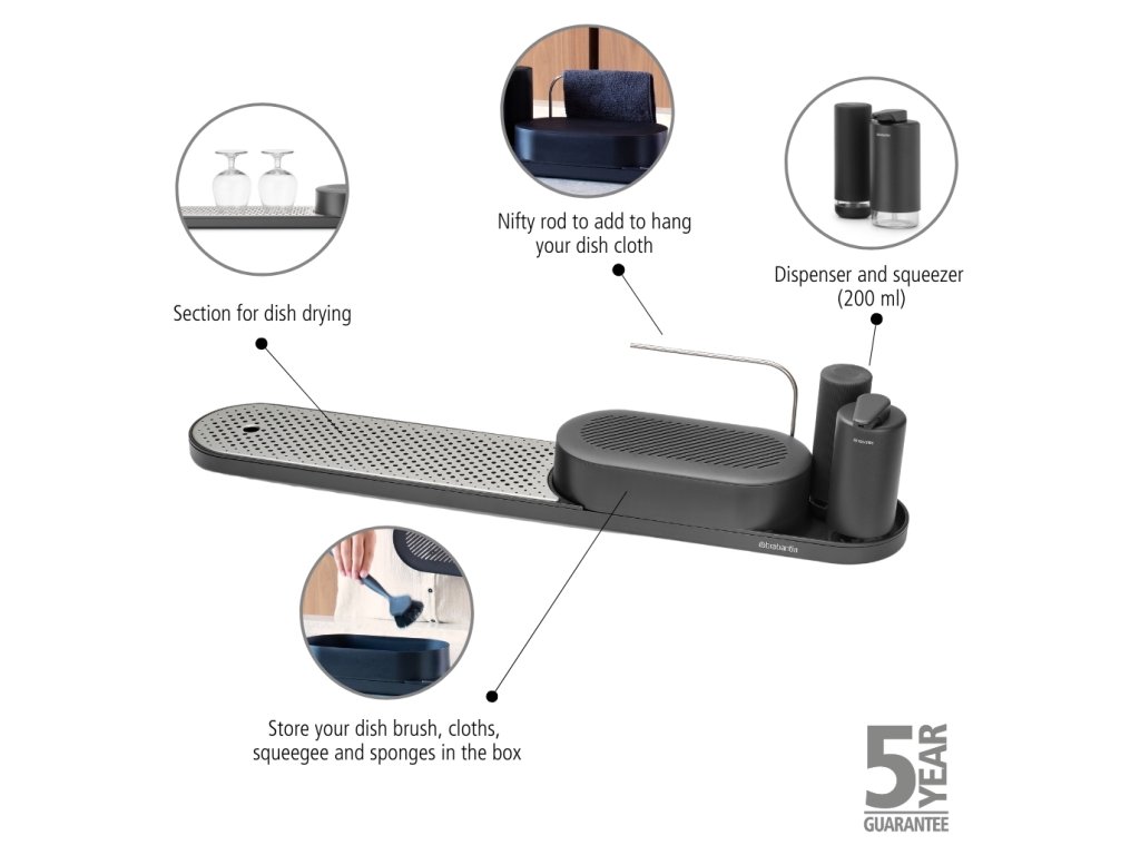 S tímto organizérem Brabantia SinkStyle, sušákem, dávkovačem mýdla a ždímačem mýdla. Tento elegantní pomocník na pracovní desku pojme vše, co potřebujete, abyste měli na pracovní desce pořádek a nádobí čisté – speciální box má dostatek místa pro schování houbiček, hadříků, kartáčku na nádobí a dalších věcí.
