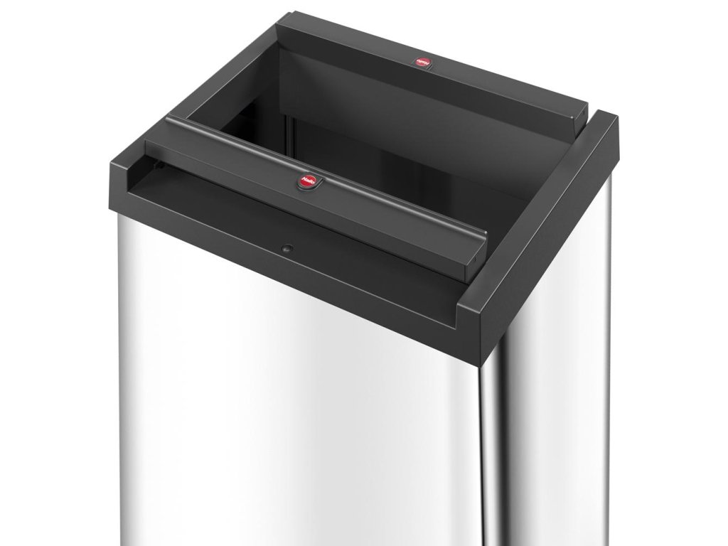 Velkoobjemový odpadkový koš Hailo Big-Box Swing má výkyvné dvoukřídlé víko s možností aretace. Optimalizovaný tvar víka s pojistkou pro otevření umožní snadné naplnění koše, poté se víko samo uzavírá. Vnitřní pytle na odpad se uchytí za červený plastový rám a nebudou už nikdy kazit čistý upravený dojem. Koše se dodávají v rozloženém stavu, jejich montáže je velmi snadná. Hranatý tvar vyzívá ke sloučení více boxů v jeden celek, třeba pro třídění odpadu.