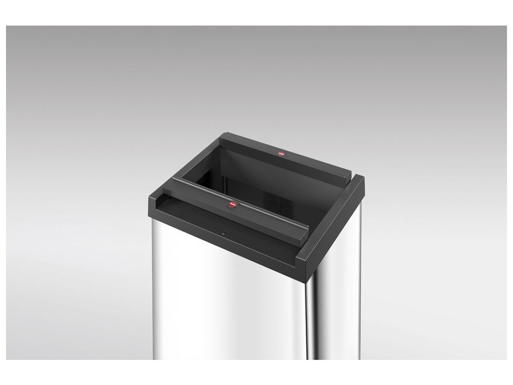 Velkoobjemový odpadkový koš Hailo Big-Box Swing má výkyvné dvoukřídlé víko s možností aretace. Optimalizovaný tvar víka s pojistkou pro otevření umožní snadné naplnění koše, poté se víko samo uzavírá. Vnitřní pytle na odpad se uchytí za červený plastový rám a nebudou už nikdy kazit čistý upravený dojem. Koše se dodávají v rozloženém stavu, jejich montáže je velmi snadná. Hranatý tvar vyzývá ke sloučení více boxů v jeden celek, třeba pro třídění odpadu.