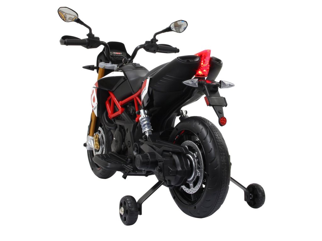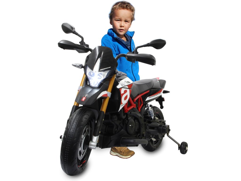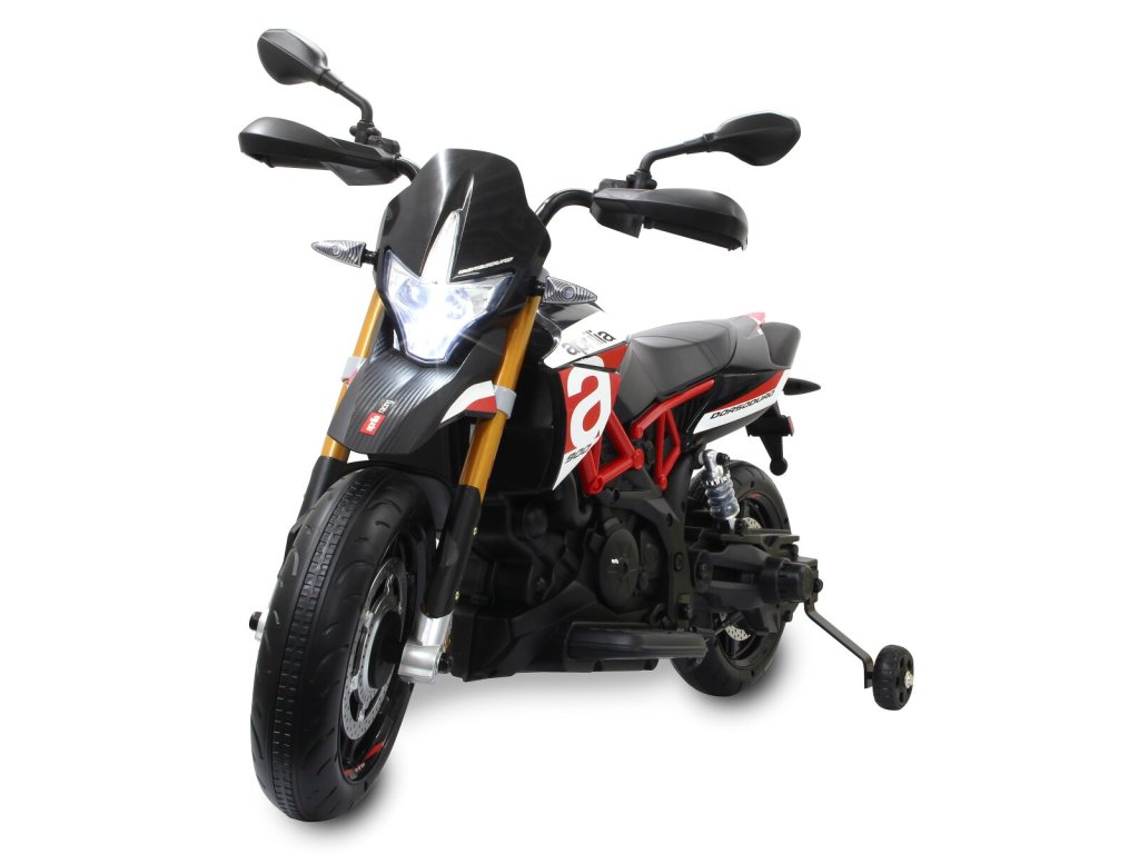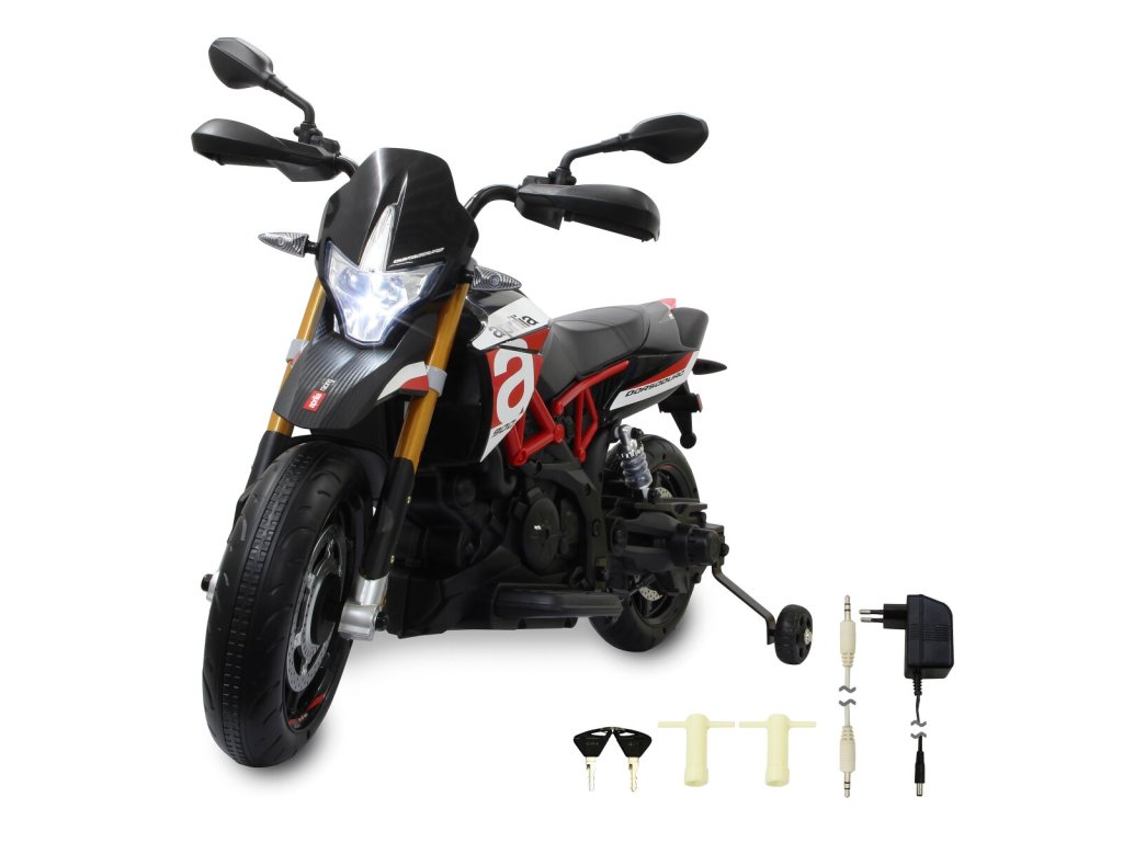The Aprilia Dorsoduro 900 is an original motorbike from the Italian motorbike manufacturer Aprilia. According to the manufacturer, this motorbike was built for the greatest possible riding fun. JAMARA is bringing this motorbike onto the market in a true-to-the-original design for children. The equipment of the bike is impressive. Memory card slot, MP3 and USB connection, LED headlights and a suspended rear swing arm with adjustable spring stiffness are just some of the highlights. Thanks to all these features, the Aprilia Dorsoduro 900 from JAMARA is of course all about riding fun. So charge the powerful 12V battery, insert the key, start and off you go - with a real engine sound. Thanks to the sturdy support wheels, even the smallest bikers can do their laps.Highlights