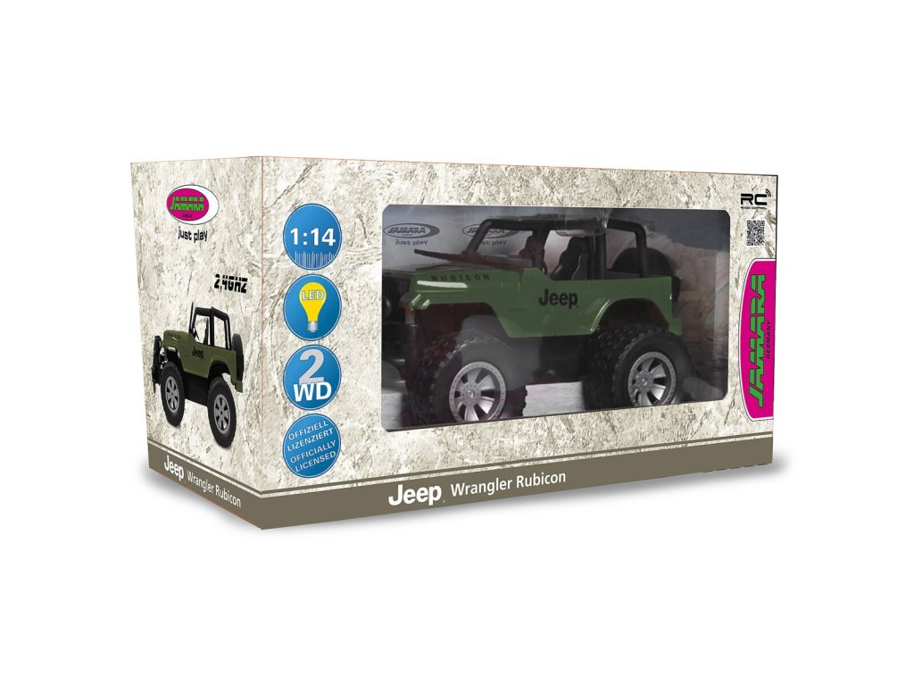 Otevřená střecha, slunce a letní pocit od JAMARA s modelem "Jeep Wrangler Rubicon" v měřítku 1:14. Věrně originální Jeep Wrangler s Přední LED světlou zaručeně vystřihne parádní figuru i v drsném terénu, protože netušíš, že díky terénním pneumatikám s dobrou přilnavostí zvládne i ty nejdobrodružnější stezky a cesty v dětském pokoji. Velký přední nárazník Jeep poskytuje ochranu a impozantní vzhled. Jeep se ovládá pomocí dálkového ovládání 2,4 GHz, které umožňuje i provoz pro více hráčů. Skutečná zábava, síť jen pro malé fanoušky Jeepu.
