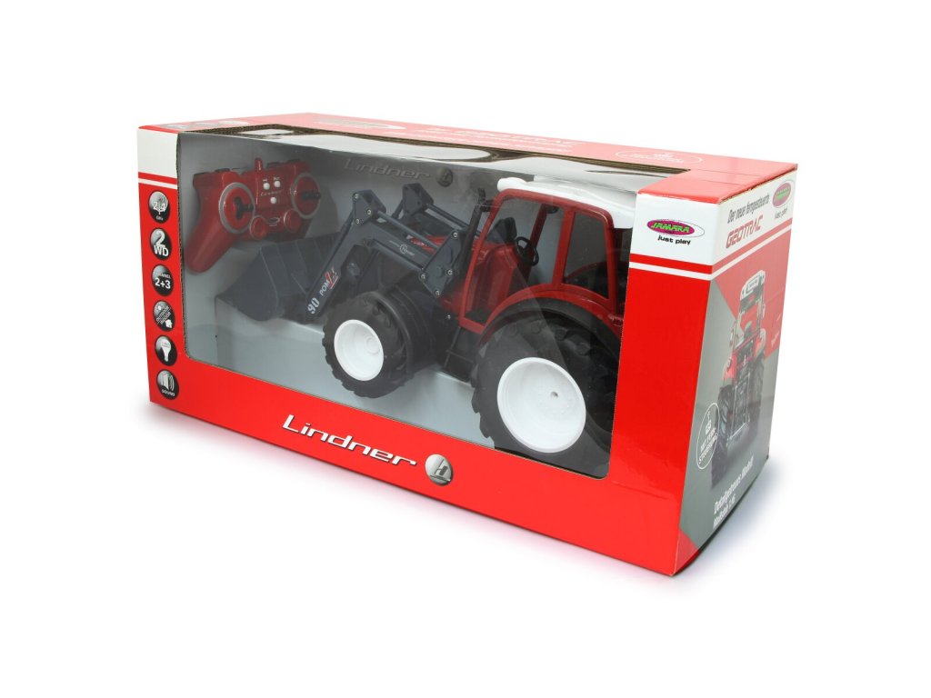 Dálkově řízený Lindner Geotrac s čelním nakladačem je dalším vrcholem řady velkých zemědělských vozidel JAMARA. Traktor byl výrobcem licencován exkluzivně pro JAMARU a má mnoho funkcí, které jsme okopírovali z originálu. V originále Geotrac kombinuje mimořádně kvalitní komponenty v kompaktním a obratném zemědělském traktoru. Tyto vlastnosti jsme nově převzali do atraktivního modelu v měřítku 1:16. Vrcholem modelu Geotrac je čelní nakladač Hauer POM-LX, který se ovládá pomocí dálkového ovládání. Stisknutím tlačítka se rameno nakladače s velkou lžící zvedá a spouští, což přináší do hry vedle jízdní funkce traktoru další zábavu. Všechna přídavná zařízení JAMARA lze připojit k univerzálnímu přípojnému zařízení a připojovací zásuvce.