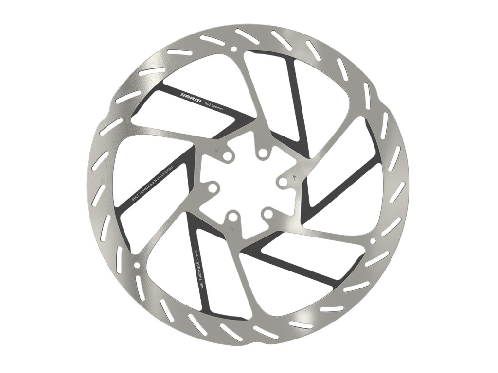 Kotouč SRAM HS2 200mm 6-šroub (v balení šrouby) RoundedZcela nový kotouč HS2 je specifický navržený pro potřeby horských kol, aby vylepšil brzdnou výkonnost, odvod tepla a zároveň snížil hlučnost. Kotouč HS2 využívá nový vzorek brzdné plochy za účelem vylepšení kontaktu s brzdovými destičky a má zapuštěné paprsky s nátěrem pro rozptýlení tepla, což z něj dělá výkonnější a tišší kotouč s nejlepším odvodem tepla ve své třídě.