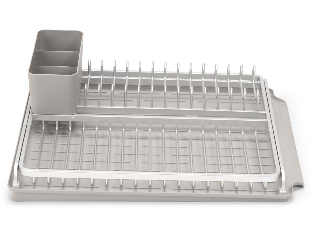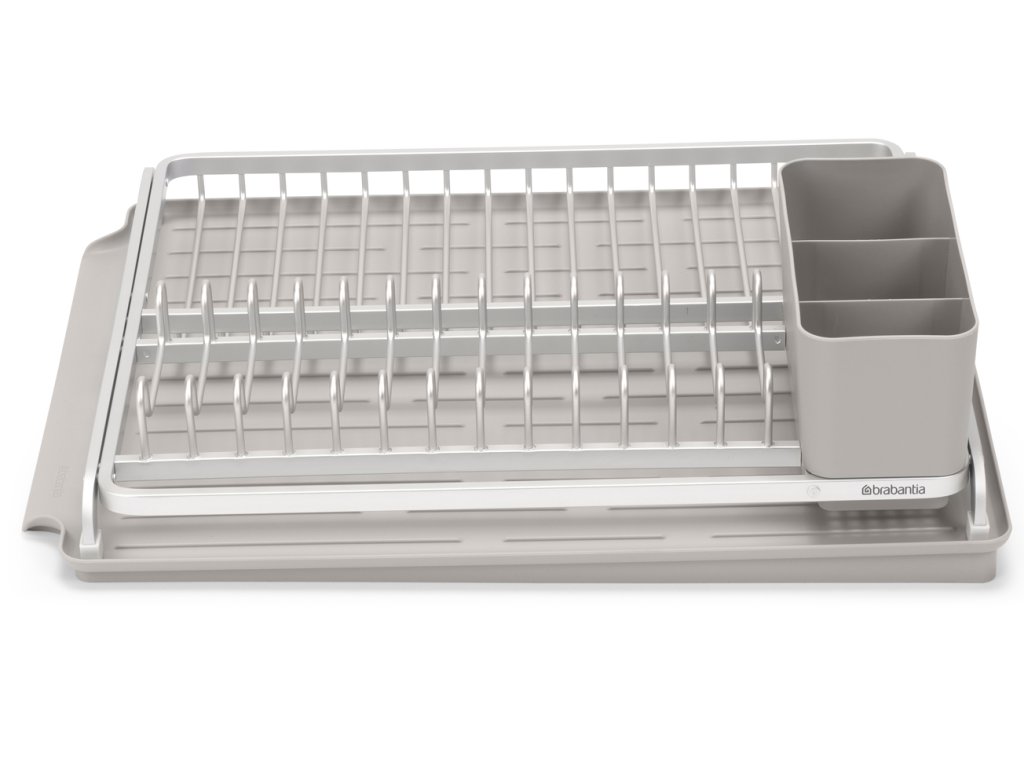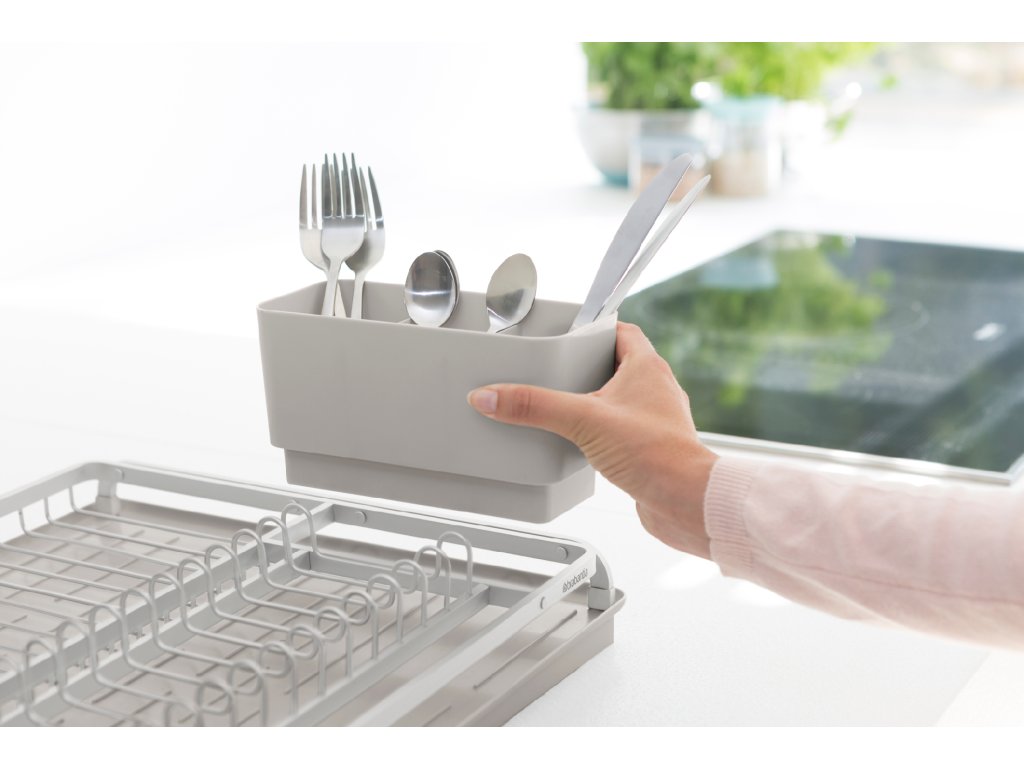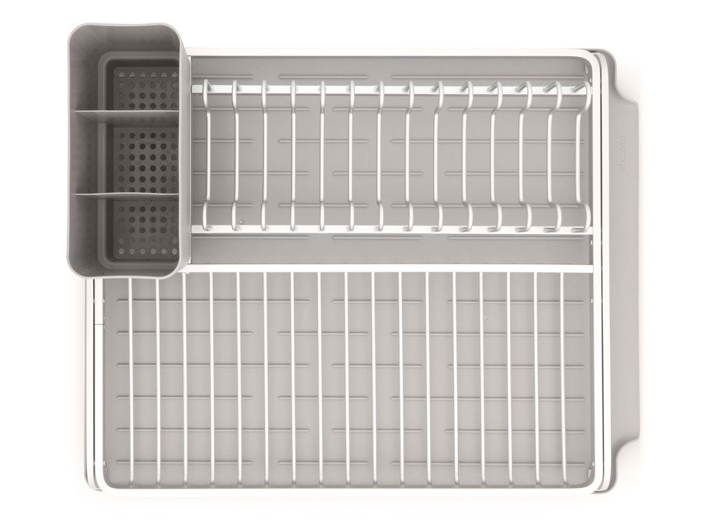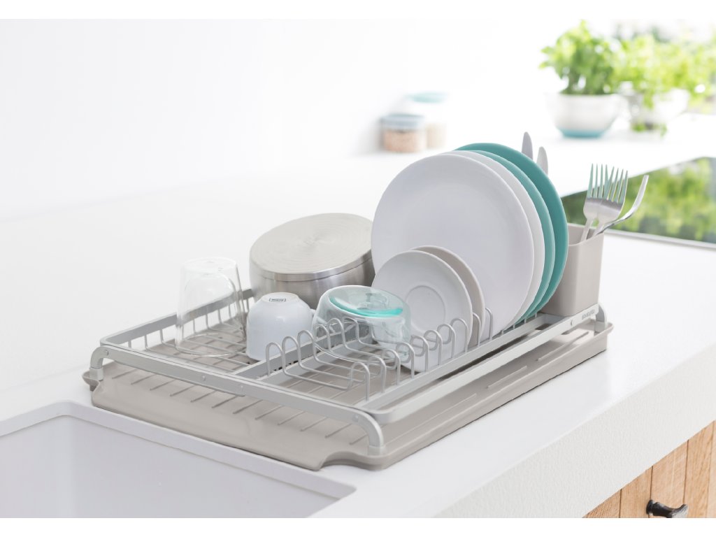 Tento odkapávač nádobí Brabantia má elegantní design a prostor až pro 13 talířů plus misky, příbory a sklenice. Má odnímatelný košík na příbory a také šikmou odkapávací misku, takže kapky stékají přímo do dřezu.