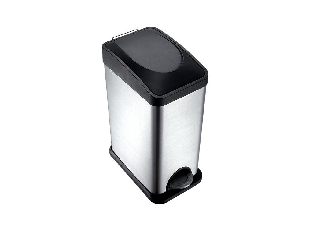 Nerezový odpadkový koš s matným designem a plastovým černým víkem v moderním stylu.