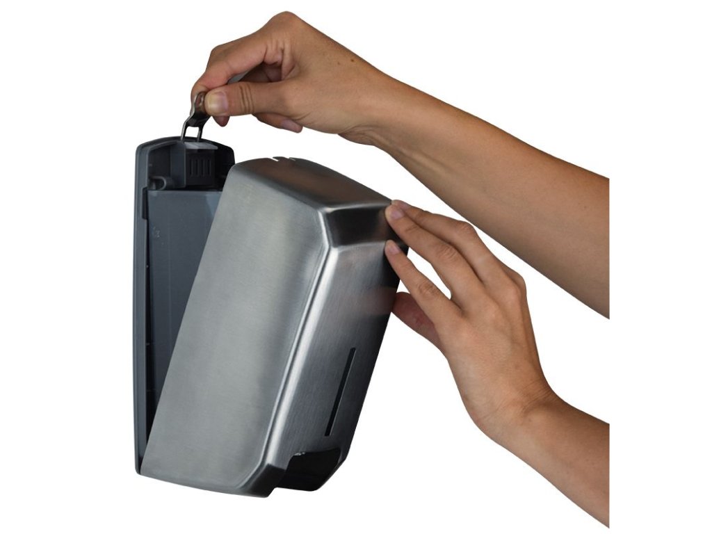 Moderní dávkovač je uzamykatelný – je odolný vůči vandalismu či vůči krádeži spotřebního materiálu. Dávkovač je vyroben z kartáčované nerezové oceli.