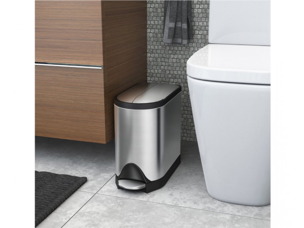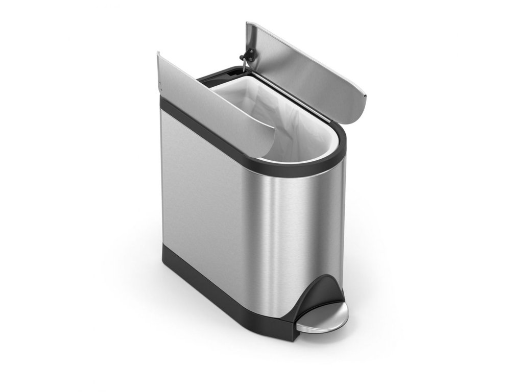 Víko odpadkového koše se otevírá na dvě strany ze středu. Díky vnitřním pantům může např. stát bezprostředně vedle toalety.
