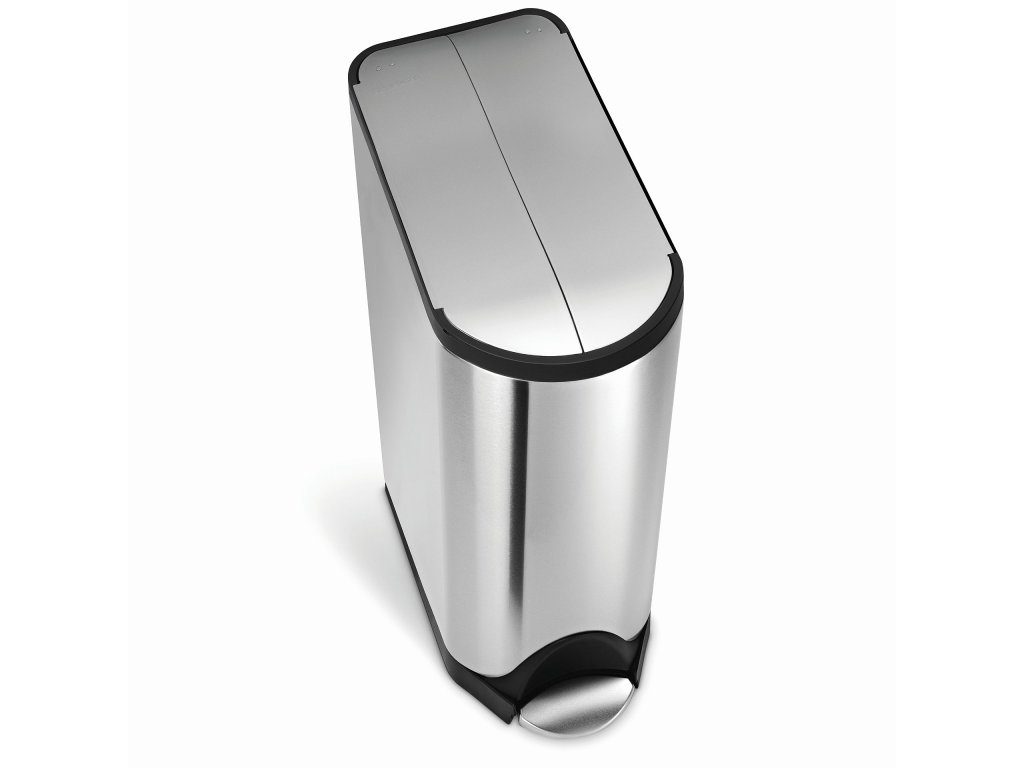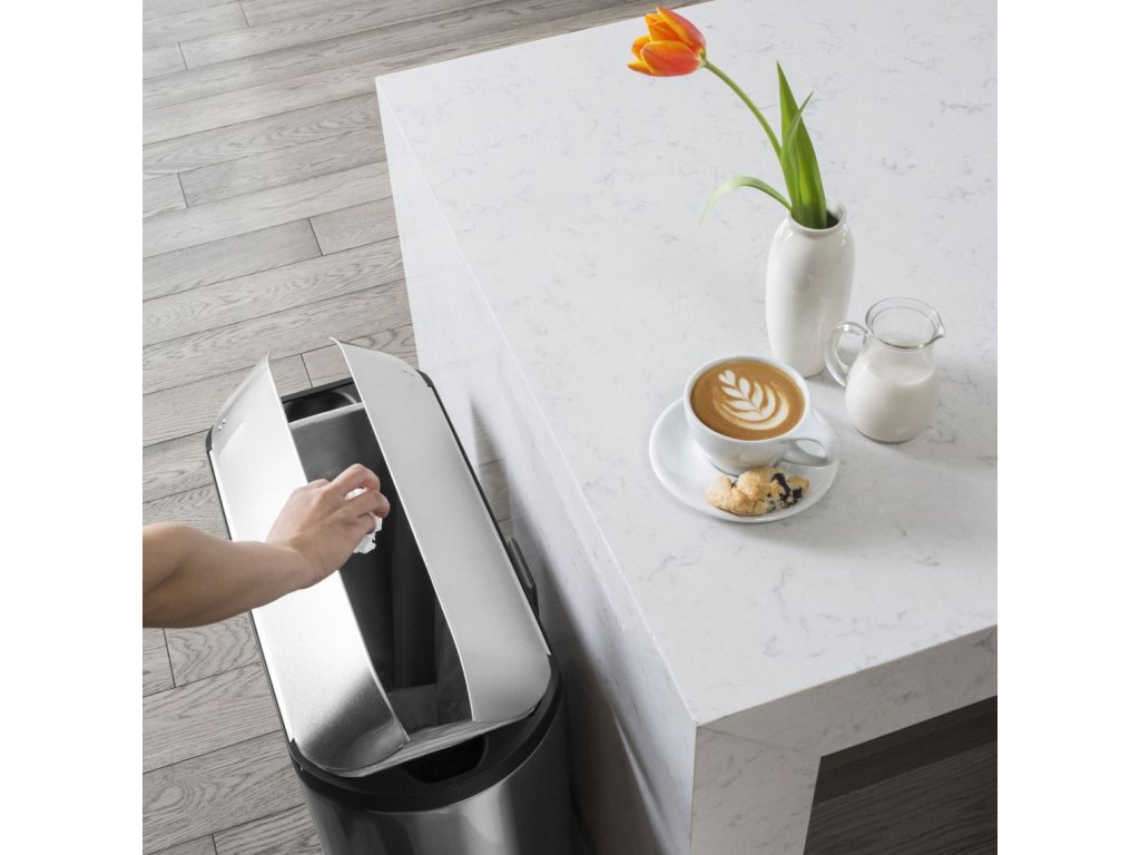 Víko odpadkového koše se otevírá na dvě strany ze středu. Díky vnitřním pantům může např. stát bezprostředně vedle toalety.