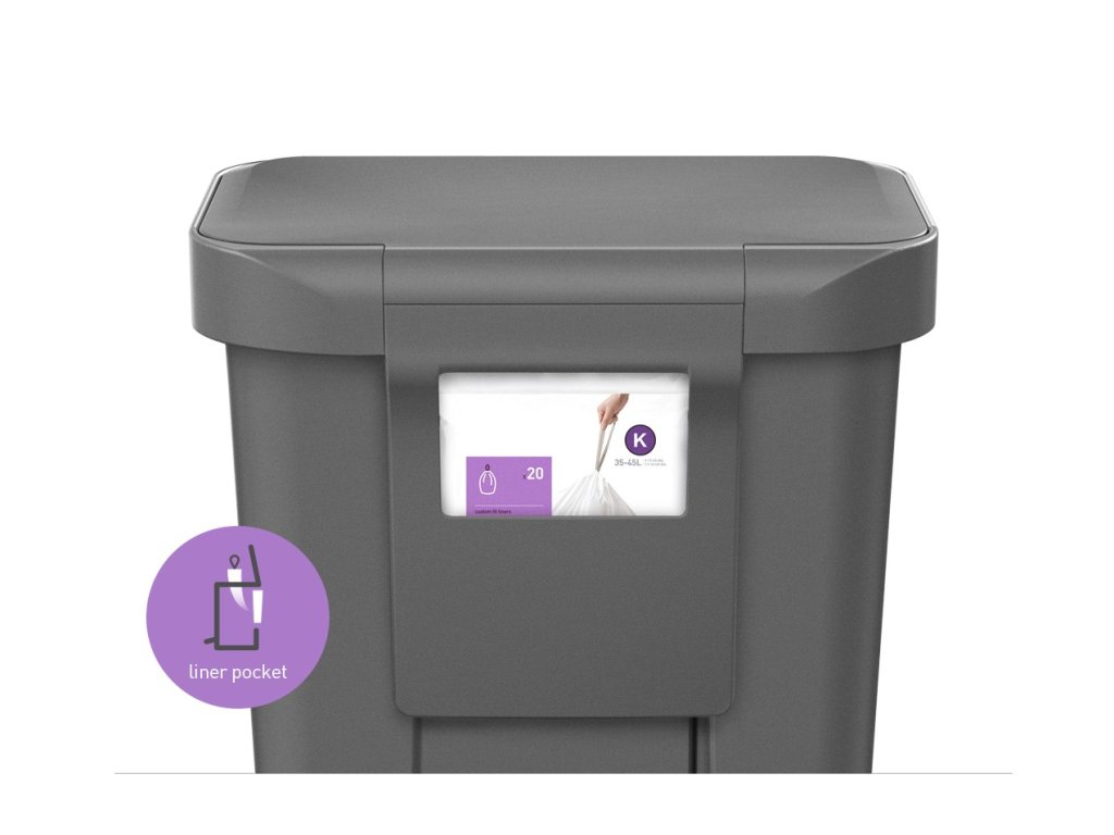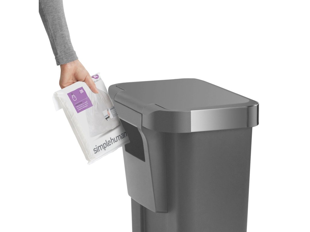 Simplehuman vyrábí vlastní odpadkové pytle. Vyznačují se vysokou pevností a snadno se z koše vyndávají. Sáčky, které přesně padnou do tohoto koše, najdete pod písmenkem K (35-45 l)