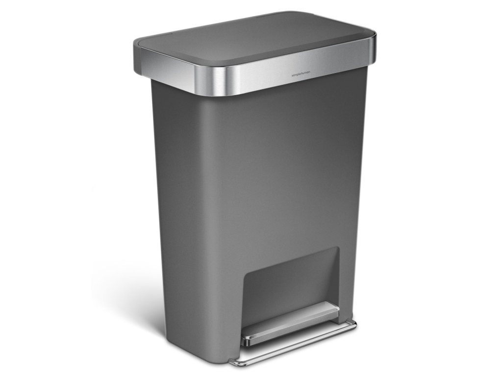 Pedálový odpadkový koš Simplehuman – 45 l, kapsa na sáčky, obdélníkový, šedý plast / nerez