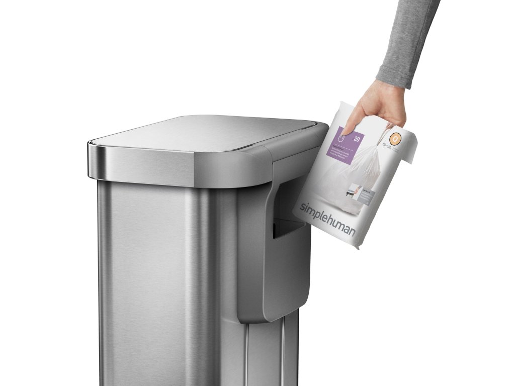Simplehuman vyrábí vlastní odpadkové pytle. Vyznačují se vysokou pevností a snadno se z koše vyndávají. Sáčky, které přesně padnou do tohoto koše, najdete pod písmenkem Q (50-65 l)