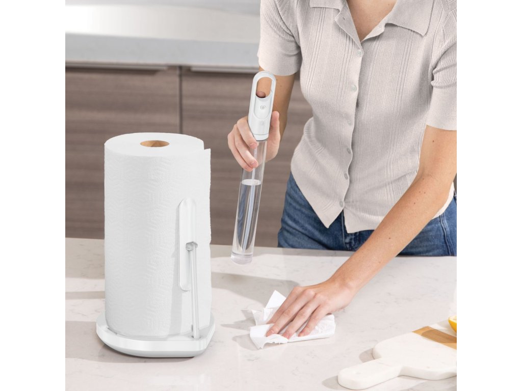 Zásobník papírových utěrek + pumpička na čistící přípravek Simplehuman, bílá ocel