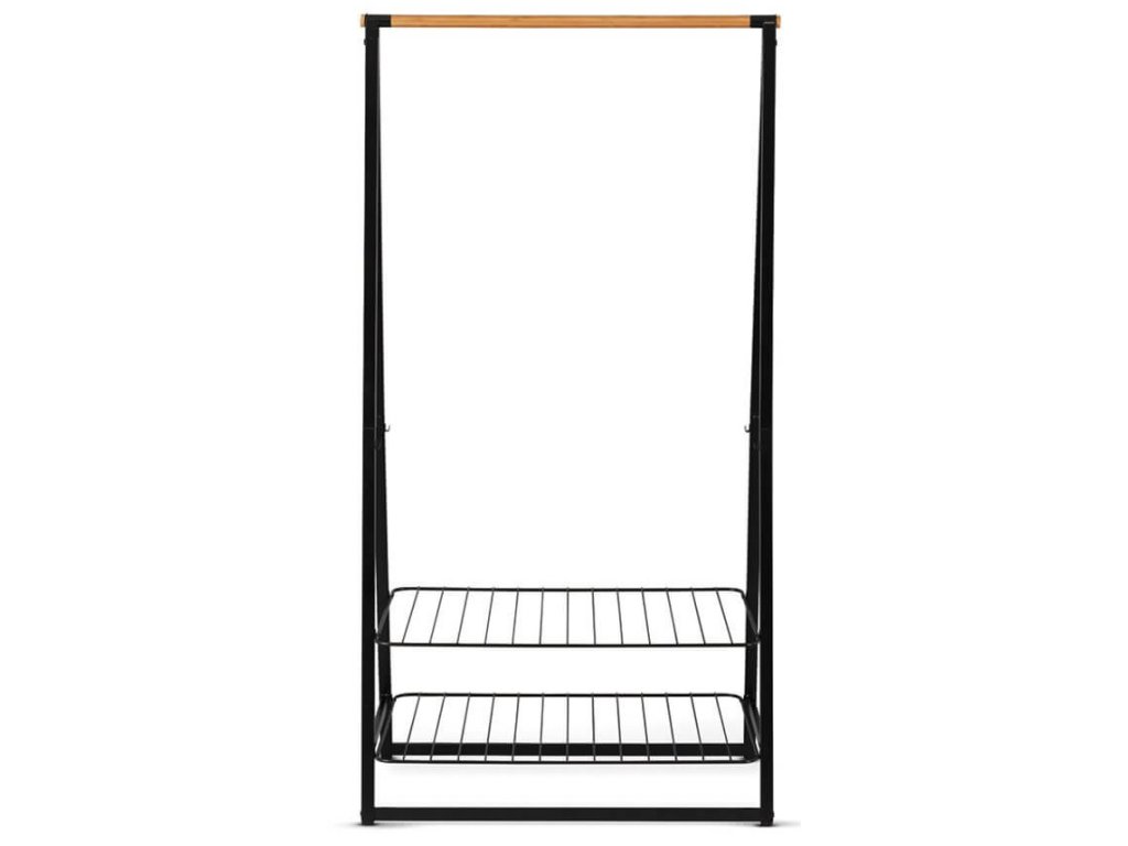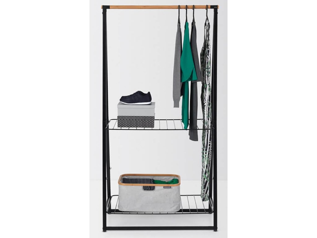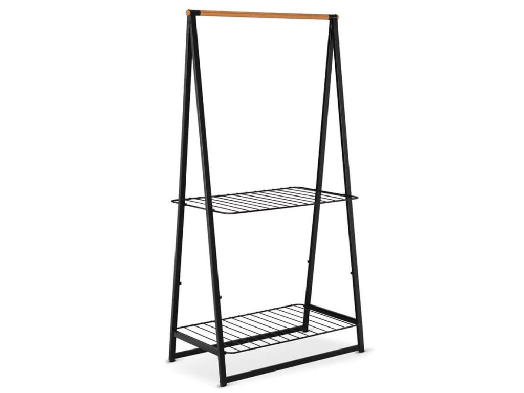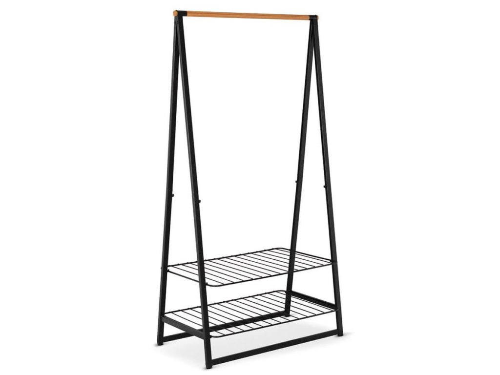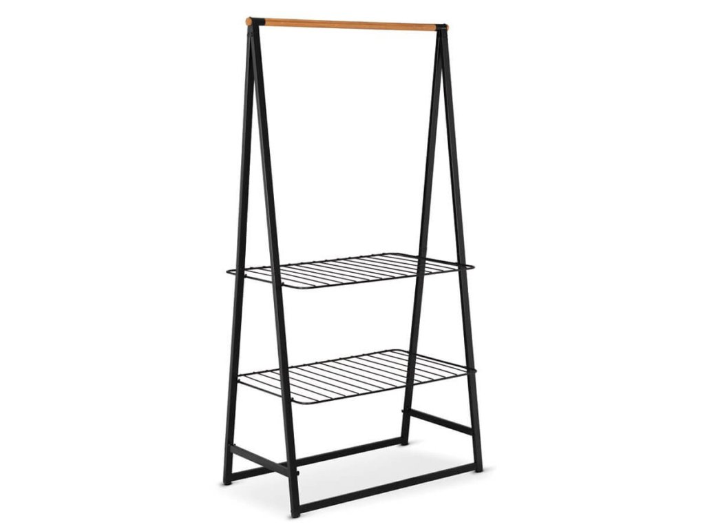 Potřebujete nějaký prostor k zavěšení, sušení nebo uložení šatů, nebo obuvi? Tento volně stojící stojan s robustní bambusovou tyčí a dvěmi výškově nastavitelnými poličkami se hodí v každém domě, nebo bytě. Snadno se přenáší. Ideální pro vaši ložnici, prádelnu nebo předsíň!