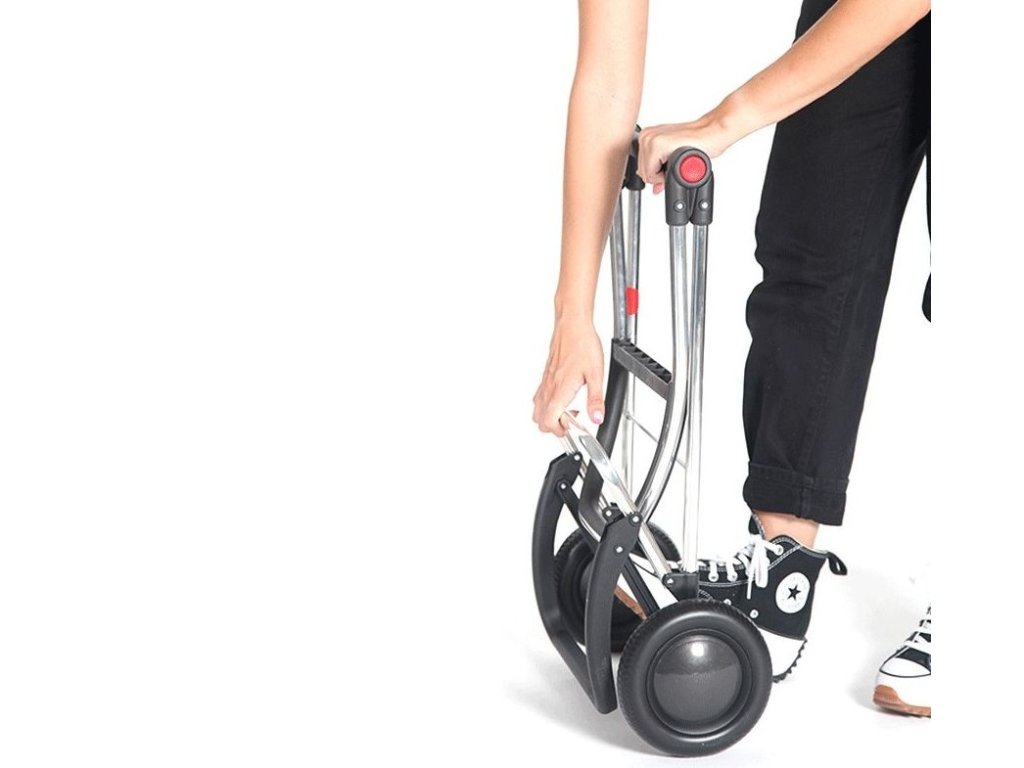 Lehká hliníková kostrukce logic s dvěma koly střední velikosti má hned několik praktických vlastností. Tou hlavní je bezesporu dvojitý skládací systém. Díky němu lze nejen složit přední oporu, která slouží k odstavení tašky do prostoru, ale také samotnou konstrukci. Pomocí bočních ovladačů (červené body) se totiž snadno složí na polovinu a lze ji pak jednoduše uložit nebo převážet v autě. Další praktickým doplňkem je integrovaný úchyt, který slouží pro zavěšení tašky na nákupní vozík a není tak nutné tašku nikde odkládat. Úchyt je zároveň opatřem drobnými háčky, které při provozu slouží k zavěšení klasických tašek či sáčků. Ergonomické protiskluzové držadlo zajišťuje komfortní úchop a přispívá tak ke snadné manipulaci. Výška konstrukce 104,5 cm je vhodná i pro uživatele vyšší postavy.