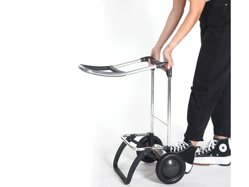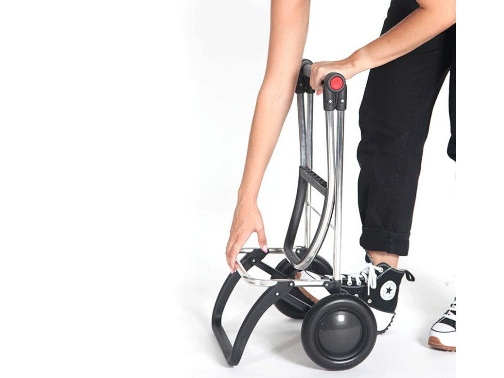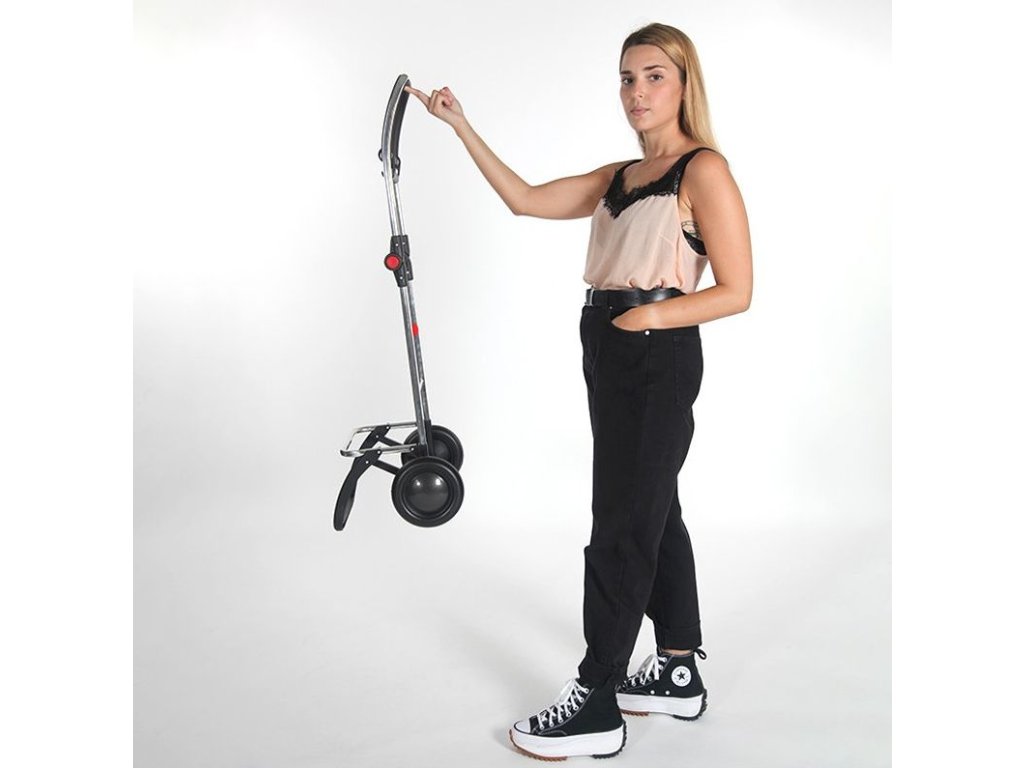 Lehká hliníková kostrukce logic s dvěma koly střední velikosti má hned několik praktických vlastností. Tou hlavní je bezesporu dvojitý skládací systém. Díky němu lze nejen složit přední oporu, která slouží k odstavení tašky do prostoru, ale také samotnou konstrukci. Pomocí bočních ovladačů (červené body) se totiž snadno složí na polovinu a lze ji pak jednoduše uložit nebo převážet v autě. Další praktickou vychytávkou je integrovaný úchyt, který slouží pro zavěšení tašky na nákupní vozík a není tak nutné tašku nikde odkládat. Úchyt je zároveň opatřem drobnými háčky, které při provozu slouží k zavěšení klasických tašek či sáčků. Ergonomické protiskluzové držadlo zajišťuje komfortní úchop a přispívá tak ke snadné manipulaci. Výška konstrukce 104,5 cm je vhodná i pro uživatele vyšší postavy.