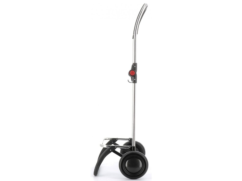 Lehká hliníková kostrukce logic s dvěma koly střední velikosti má hned několik praktických vlastností. Tou hlavní je bezesporu dvojitý skládací systém. Díky němu lze nejen složit přední oporu, která slouží k odstavení tašky do prostoru, ale také samotnou konstrukci. Pomocí bočních ovladačů (červené body) se totiž snadno složí na polovinu a lze ji pak jednoduše uložit nebo převážet v autě. Další praktickou vychytávkou je integrovaný úchyt, který slouží pro zavěšení tašky na nákupní vozík a není tak nutné tašku nikde odkládat. Úchyt je zároveň opatřem drobnými háčky, které při provozu slouží k zavěšení klasických tašek či sáčků. Ergonomické protiskluzové držadlo zajišťuje komfortní úchop a přispívá tak ke snadné manipulaci. Výška konstrukce 104,5 cm je vhodná i pro uživatele vyšší postavy.