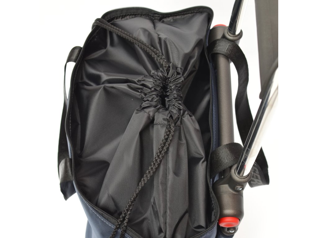 Hlavní úložný prostor tašky Mini Bag nabízí objem 15 L, který lze zvětšit pomocí všitého nástavce až na 21 L. Její maximální nosnost je až 40 Kg, avšak doporučené zatížení 25 kg. Vnitřní prostor je vybaven menší dvojitou kapsou na zip pro bezpečné uložení osobních věcí (peněženka, klíče, mobil), z vnější strany lze pak využít větší kapsu taktéž uzavíratelnou pomocí zipu. Zavírání tašky je řešeno zipem, ale v případě použití nástavce chrání nákup stahovací šňůrka. Taška je na vozík navlečena přes textilní tunel a v horní části připevněna suchým zipem, lze ji tedy použít i bez vozíku jako běžnou tašku nejen na nákup.