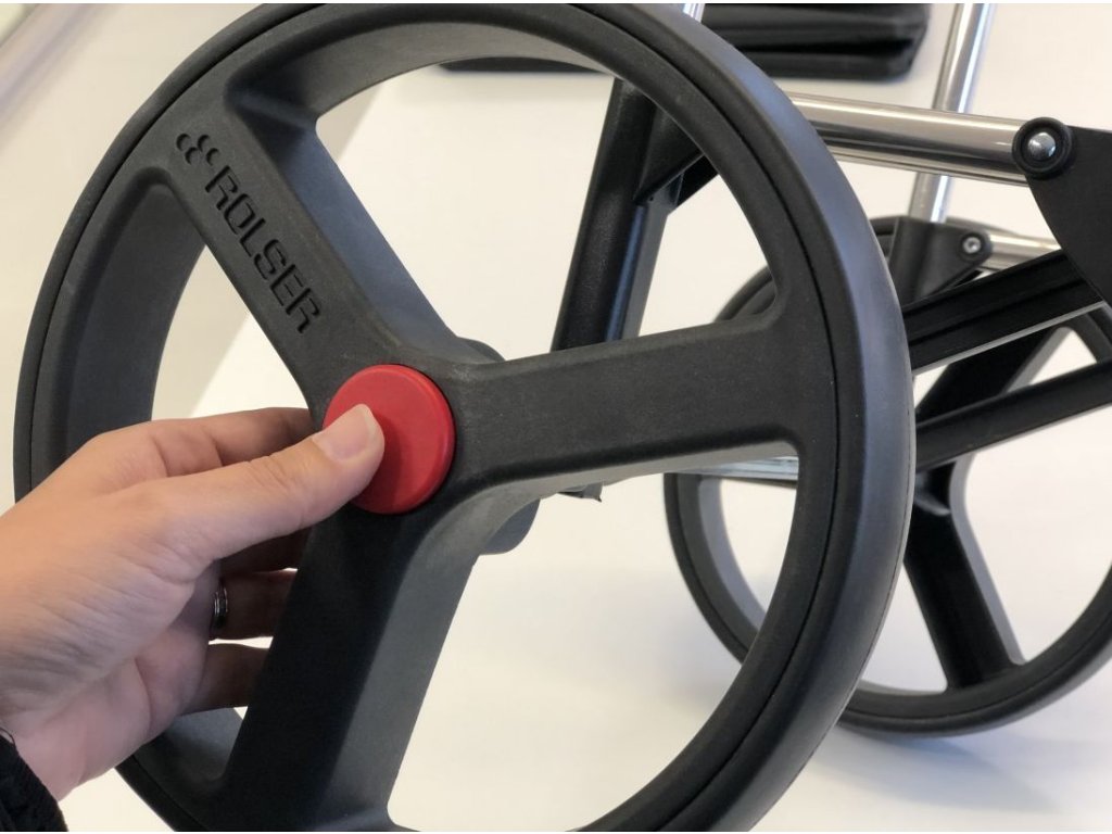 Podvozku dominují dvě sportovní kola o velikosti XL, která jsou jako stvořená pro hladké zdolávání terénních nerovností. Ať se vám do cesty postaví jakákoli překážka, snadno ji překonáte. Rychloupínací systém v podobě červených bodů, umožňuje jednoduše sundat kolečka a dosáhnout tak dokonale plochého tvaru. Tašku tak snadno uložíte třeba za skříň či pod postel.