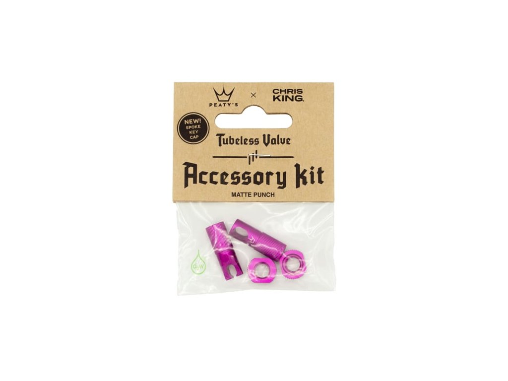 Ať už jste ztratili čepičku ventilku, nebo toužíte po nestandardní barevné kombinaci, sada Accessory Kit* bude pro vás vítaným východiskem. Obsah balení: 1x centrovací klíč pro standardní 3,4mm nipple 1x klíč na vyšroubování vnitřního ventilku 2x pojistná matka * Kompatibilní se všemi bezdušovými ventily Peaty’sDoplňkové parametry