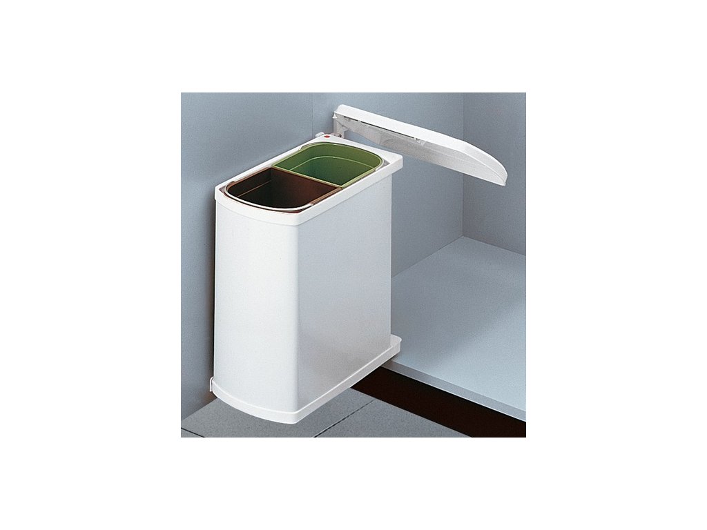 Koš je na otočném kloubu a víko koše se odklápí pomocí mechanismu při otevření dveří skříňky. Díky malé vestavné hloubce lze montovat např. do skříněk pod dřez s drtičem odpadků. Koš se otevírá při otevření skříňky, je namontován na dvířka - pravostranná i levostranná montáž.