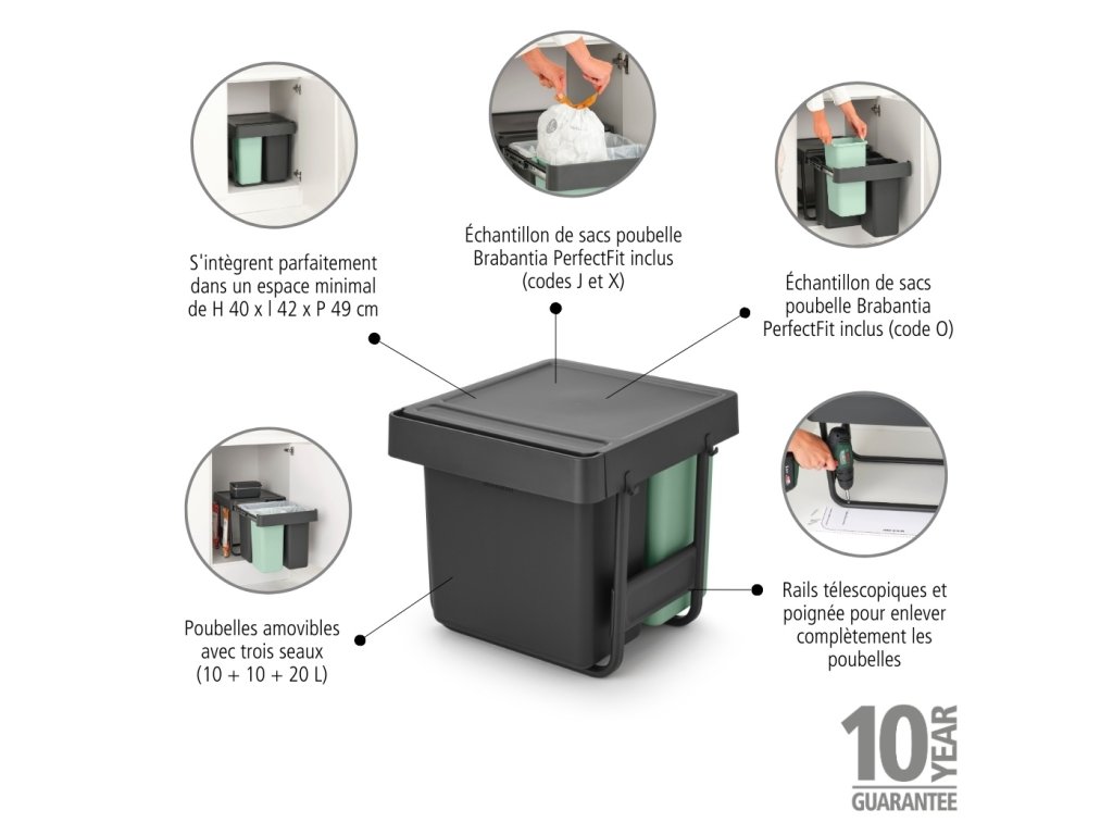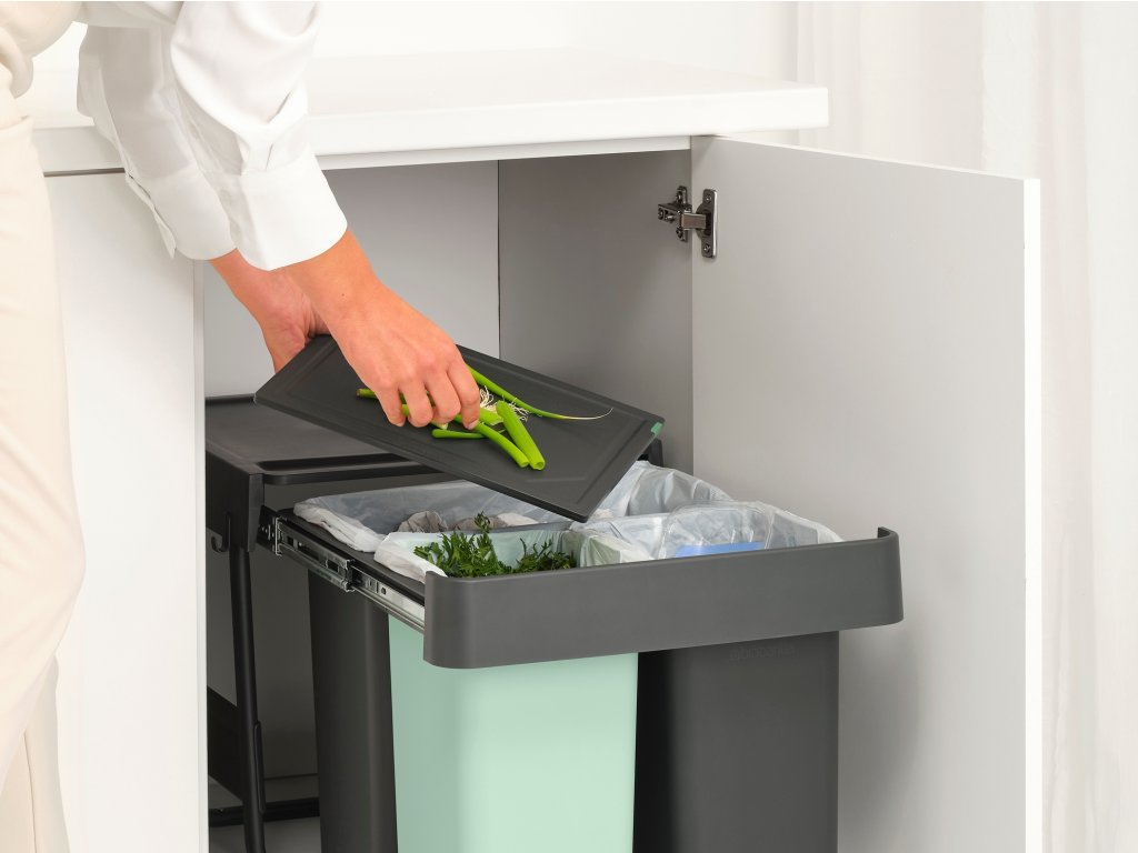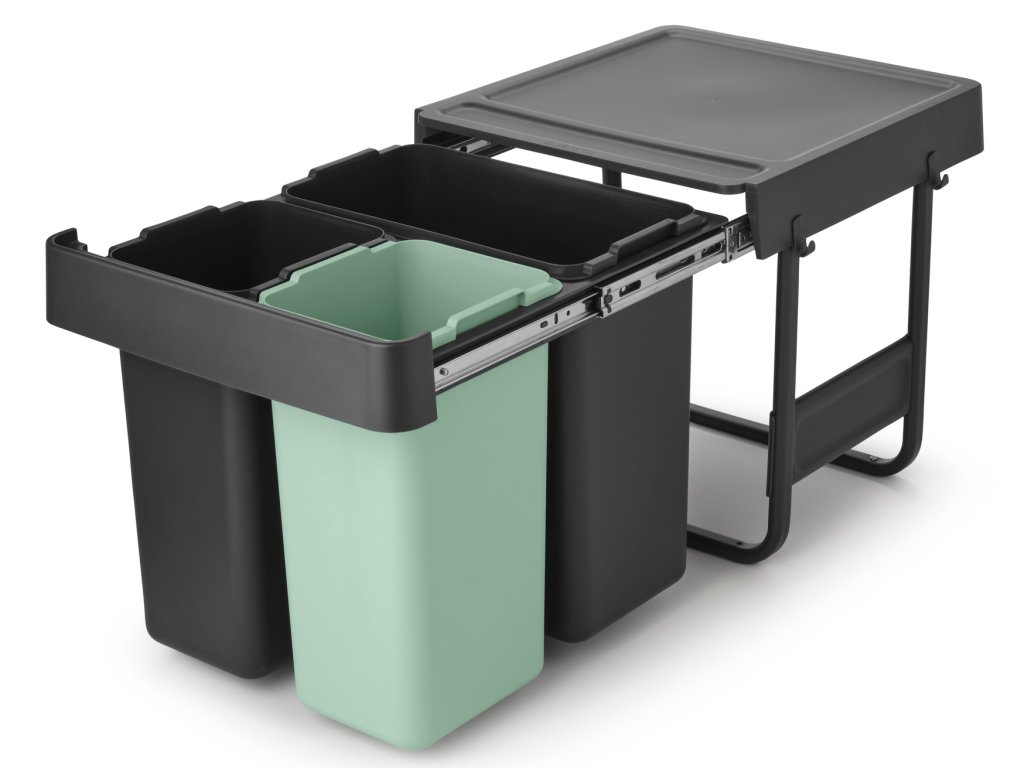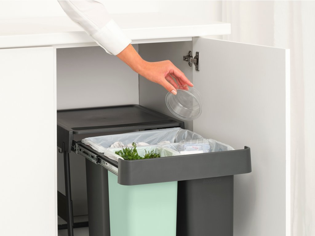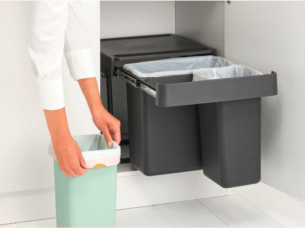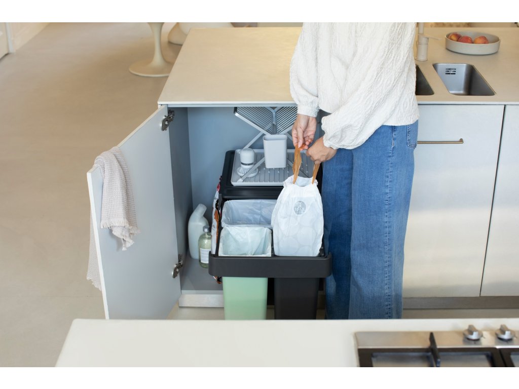 Ztrojnásobte svůj výkon při třídění odpadu, aniž byste ztratili podlahovou plochu, s vestavěným košem Brabantia Sort & Go 10+10+20 litrů. Vyrobeno tak, aby se dalo schovat do skříně, se snadnou instalací montážního rámu (samonosný, takže žádné prohýbající se dvířka!). Tyto diskrétní přihrádky se vejdou do většiny kuchyňských skříněk, ať už se dvířka otevírají doleva nebo doprava. Mají dokonce úložný prostor nahoře a háčky na straně pro extra organizaci. S dlouhou teleskopickou lištou, takže je můžete celé vytáhnout jednou rukou. A samozřejmě se dají snadno čistit, vyndavat a vyprazdňovat. Skvělá sada.