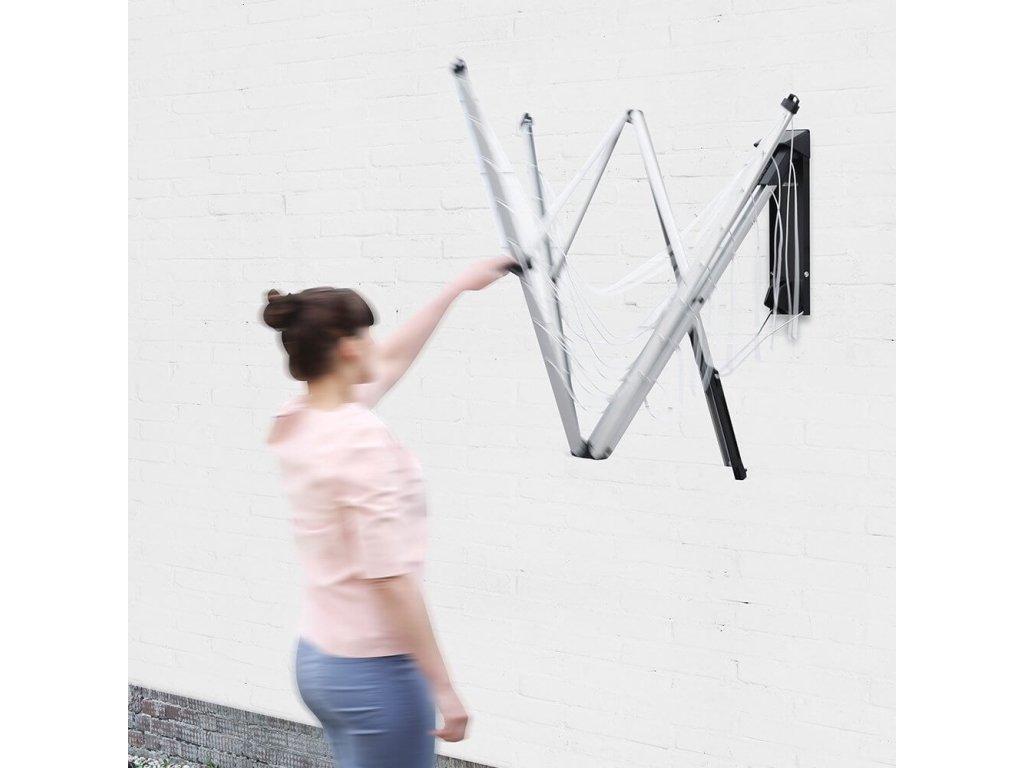 Obrovskou výhodou sušáku Wallfix je v jeho dokonalé skladnosti. Po rozložení nabídne až 24m šňůr